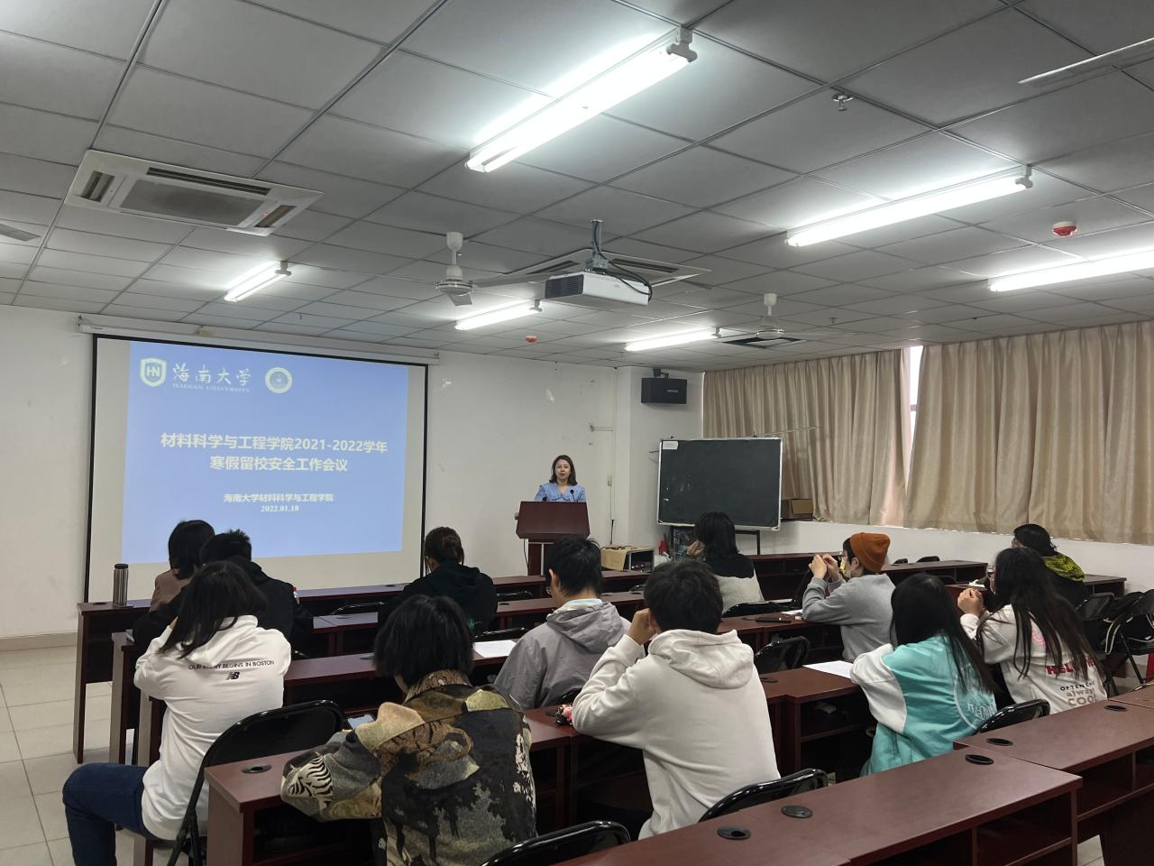 会上,学工办负责人郎筱宇根据学校有关管理规定,并结合我院实际情况就留校生疫情防控措施落实、住宿管理、违章电器等规章制度、衣食住行等后勤服务、安全教育等各方面作出安排。同时,强调指出留校学生要严格执行每日健康报备,严格遵守 “四必报告”制度,即出岛必报,前往中高风险地区必报,出国(境)或回国必报,体温异常必报。不私自出省,严格遵守请假审批制度。
