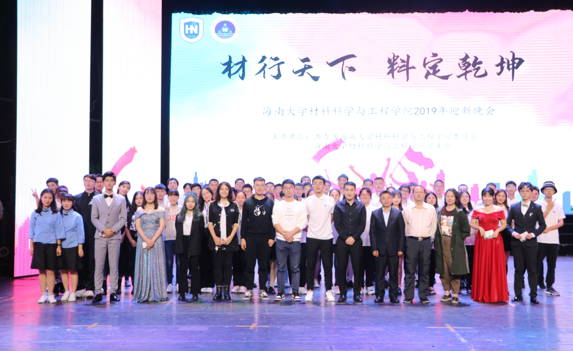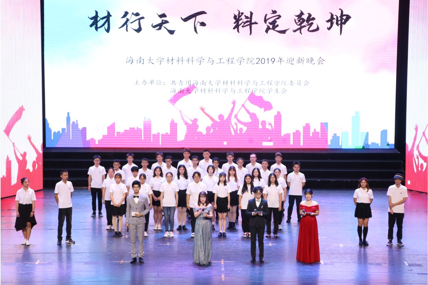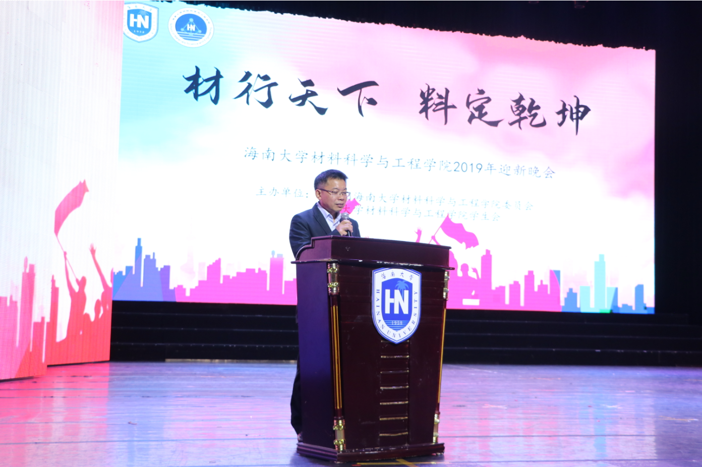 晚会于晚七点半正式举行,由学院2019级本科新生李宜泽、冯嘉慧、王士诚和李娇担任晚会主持。在热情澎湃的开场舞过后,是一段以爱国情怀为主旋的朗诵。随后,胡先文书记上台发言,代表学院表明对迎新晚会的支持,以及对2019级本科生和研究生新生入学以来优秀表现的肯定,胡书记指出材料学院是一所追求进步、承载着梦想和希望的学院,秉承“崇德明志 求是唯实”的院训,不断加强内涵建设,提高办学质量,得到了社会各界的一致认可。今年是海南推进自贸区港建设和学校深化内涵发展、不断追求卓越的关键年,材料师生的求学梦与之深度交织,这是时代赋予海大的重大机遇也是大家的人生际遇。如今,崭新出发的19乘着新时代的浩荡东风,定将不负众望、继往开来、砥砺奋进,早日成为引领未来材料的佼佼者。