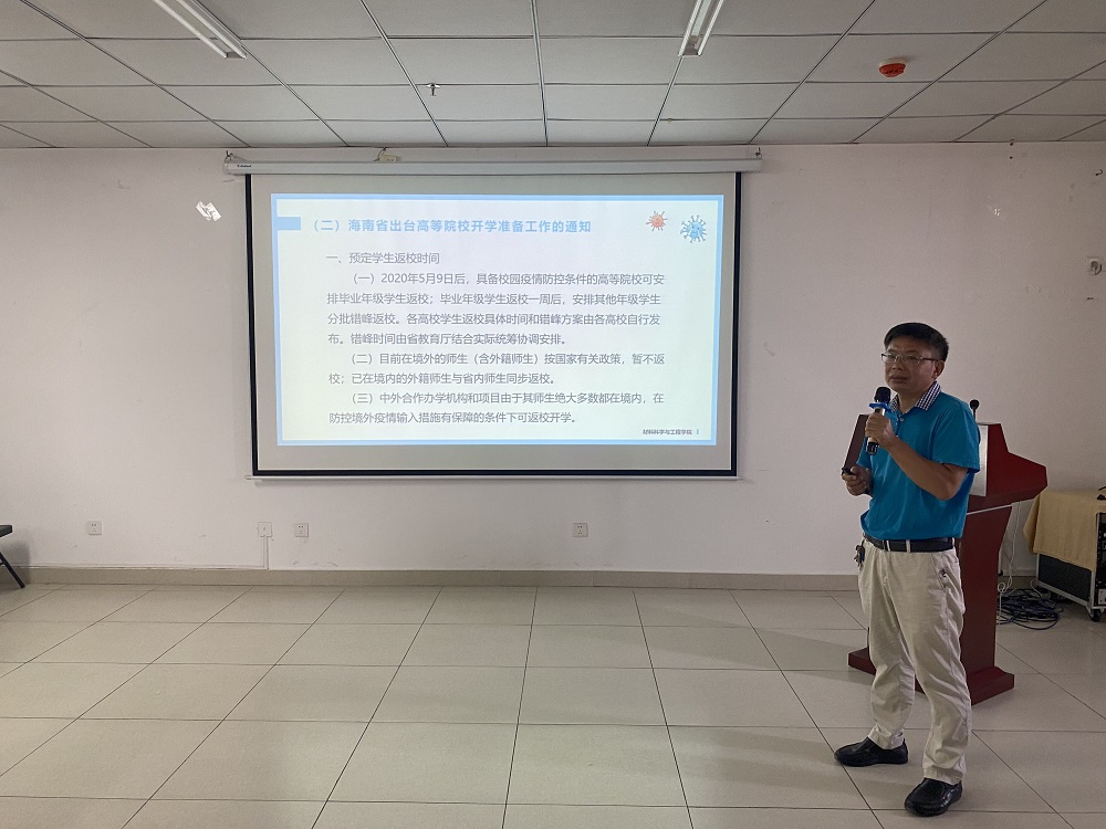 廖建和院长就学院办学理念、人才培养定位以及学科建设和大家在线分享。他指出,学院目前已经确定了以“天然橡胶材料、热带岛屿工程材料、海洋能源工程材料和生态环境材料”四个方向的学科建设主线,以专业认证为抓手,新工科人才培养为手段,“本硕博培养一体化”为支撑,对接海南十二大主导产业,面向全国、辐射东南亚, 努力建设成为我国热带、海洋高水平材料类专业人才培养和高水平材料科学研究基地,为国家南海战略服务和南海相关的海洋材料工程科学提供技术支持的办学目标。他强调,“一方有难、八方支援”磅礴的中国力量鼓舞着我们的每一个人!但与此同时,病毒根源及特效药仍悬而未决,说明科学研究还有很多未知领域,希望同学们依托学院的发展平台,抢抓海南自贸港建设的时机,专注科学研究并发奋学习,掌握过硬本领,赢得国家、社会和人生的大考。