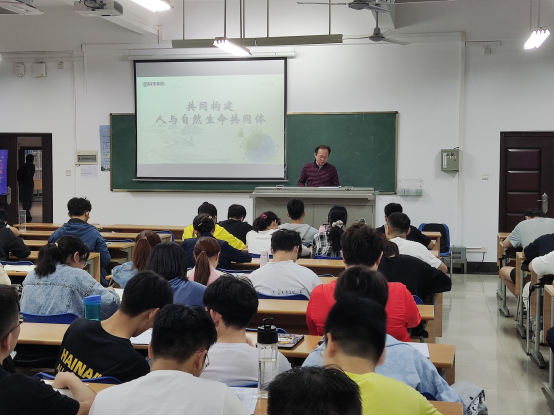 学院副院长林仕伟以“共同构建人与自然生命共同体”为主题进行授课,林院长向同学们介绍了当前气候变化、海洋污染、生物保护等全球性环境问题,世界各国应当风雨同舟、齐心协力,共同保护不可替代的地球家园。他讲到当前全球环境治理面临种种挑战,生态环境危机时刻威胁着人类生存,全球行动、全球应对、全球合作是人类唯一的选择。同时中国作为全球生态文明建设的参与者、贡献者、引领者的积极作为,是为人类共同的美好未来而谋,是保护我们共同的地球家园的历史担当。