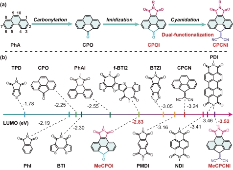 强缺电子单元在N型高分子半导体材料的开发中起到重要作用。近日,小宝影院 材料学院陈志才副教授与南方科技大学郭旭岗教授合作,采用菲稠环单元(PhA)为核心,通过酰亚胺基,羰基或氰基双功能化的策略,设计、合成了新型的受体单元CPOI和CPCNI。其中 CPCNI的理论计算LUMO能级深至-3.52 eV,缺电子性能力强于经典强受体结构单元NDI(-3.41 eV)和PDI(-3.46 eV)。电化学测试结果进一步证明了上述结论,CPCNI的实验测试LUMO能级可以深至-3.84 eV。