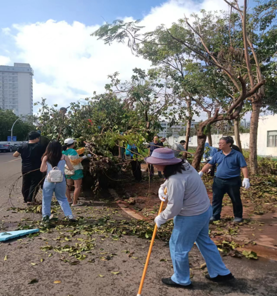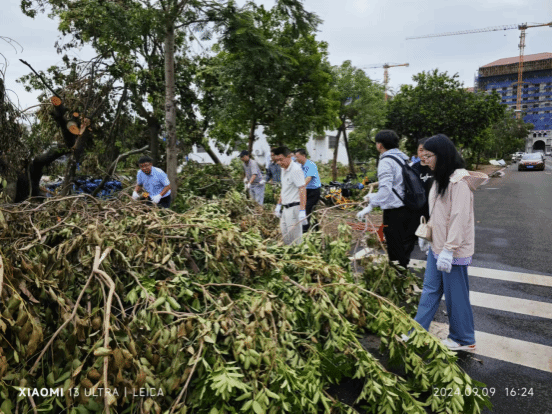 学院从9月8日到9月13日,在学院党委的组织领导下,先后组织5次志愿者活动,进行校园主干道清理工作。党员同志充分发挥先锋模范作用,迎难而上。学院教职员工积极参与,大家一同克服困难,齐心协力,对校园内的倒伏树木、积水与杂物进行了清理,出色完成了相应片区倒扶树木及垃圾的清理工作。