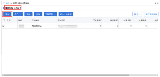 2.进入页面后,【扣除年度】默认显示为小宝影院【税款所属月份】对应的年度。点击【添加】按钮,打开添加页面。