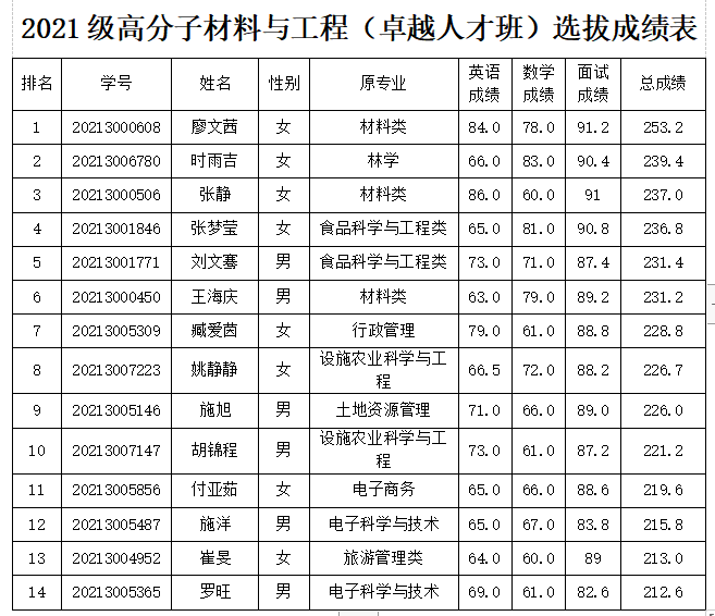根据小宝影院 《关于做好 2021 级普通本科特色班级选拔工作的通知》(海大教[2022]5号)和《关于开展 2021 级特色班级招生选拔二次志愿征集工作的通知》(海大教[2022]19号)文件精神,由学生本人自愿报名,经过英语、数学考试和面试等环节,在政治思想、身体状况满足条件的前提下,按英语+数学+面试的总成绩由高到低排序,择优录取14名同学,组建2021级高分子材料与工程卓越人才班。