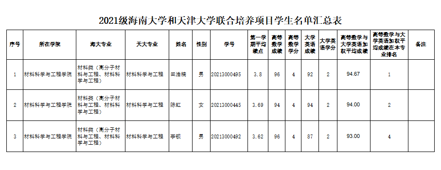 根据《教育部办公厅关于做好对口支援高校联合培养本科生等有关工作的通知》(教高厅[2010]1号)、《小宝影院 与天津大学联合培养本科生工作方案》和小宝影院 教务处《关于选派2021级学生参加小宝影院 和天津大学联合培养工作的通知》(海大教[2022]18号)的文件精神和要求,学生在符合基本条件基础上,以“高等数学”和“大学英语”课程成绩的加权平均分由高至低确定获得联合培养资格的学生名单。