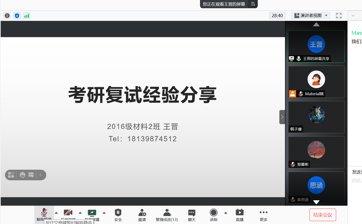 为做好2021年研究生复试服务工作,提高2017级同学研究生复试成功率,近日,材料学院面向2017级同学召开了考研复试成功同学经验交流会。会上邀请了2016级考研成功同学进行了经验交流和分享,会议由辅导员郎筱宇老师主持。