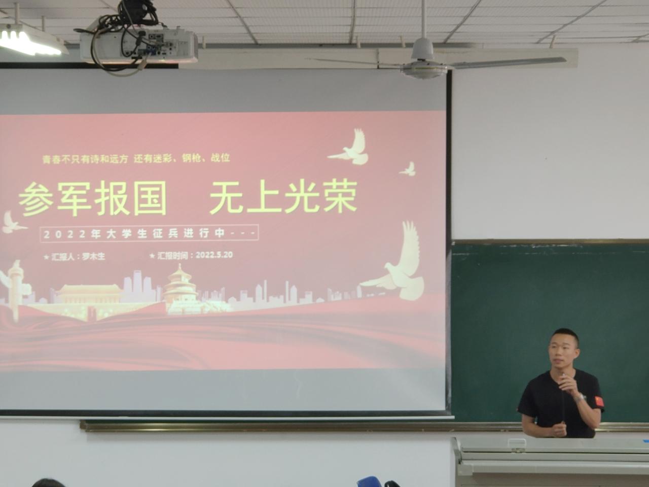 叶泸伟老师结合自身的从军梦想和求学经历来激励同学们积极入伍,向学生强调了大学生参军入伍对军队现代化建设的重要意义,号召同学们踊跃参军入伍,报效国家。