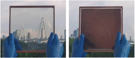 图2 尺寸为400 cm2的电致变色器件在着色态和褪色状态下的光学图像